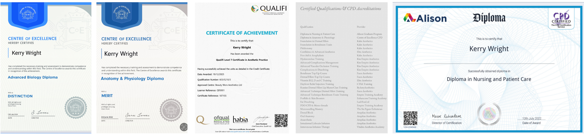 Kerry Wright Aesthetics combines a strong foundation in medical science with a deep commitment to patient care, holding a Distinction Diploma of HIgher Education in Nursing and a DipHE in Advanced Biology. Her dedication to ongoing clinical development ensures every treatment is delivered with precision, safety, and the highest standard of care.